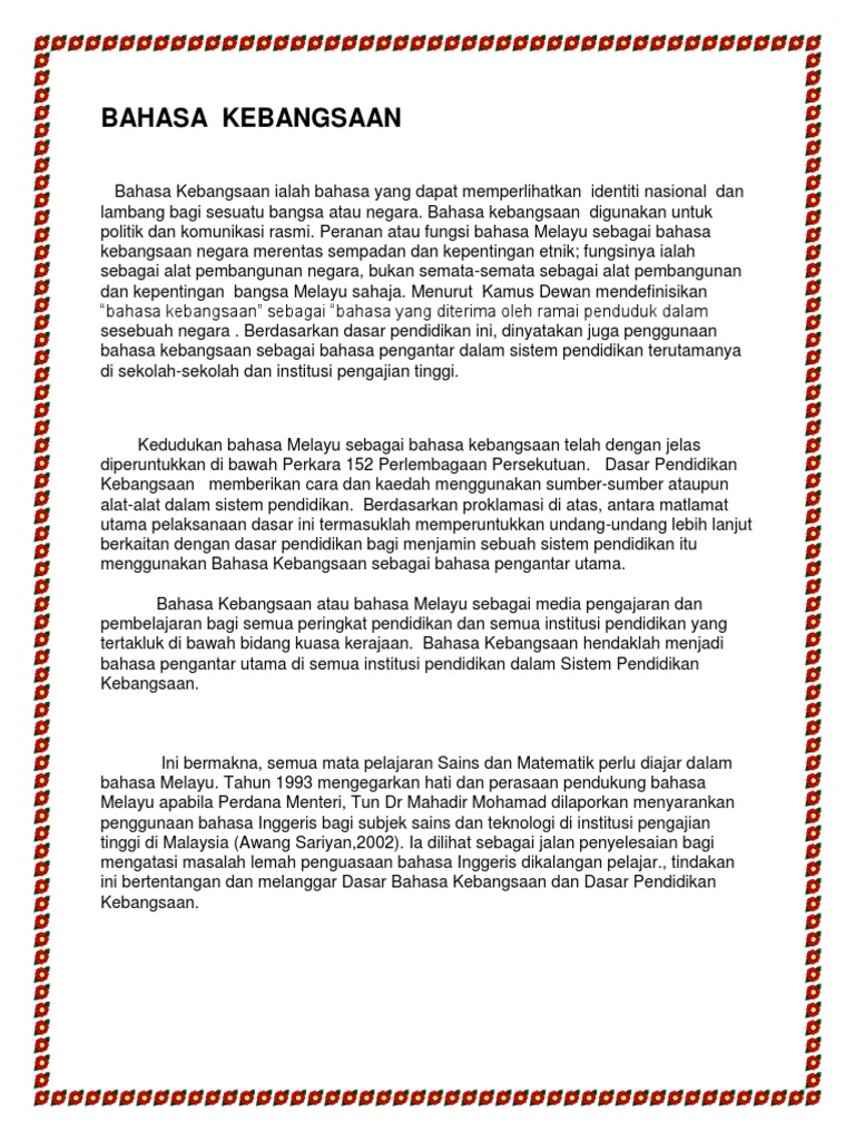 Copy Of Mpw1113 Bahasa Kebangsaan from reader015.dokumen.tips 1) bahasa resmi kenegaraan, 2) bahasa pengantar dalam. Krisis identiti bahasa dalam masyarakat malaysia. Sejak itu, kewibawaan bahasa melayu sebagai bahasa ilmu terus dikembang dan dirancang sebaik mungkin terutamanya sebagai bahasa pengantar utama dalam sistem pendidikan negara, khususnya selepas malaysia mencapai kemerdekaan. Munalizatul binti daud no matrik: Pada tahun 1976, semua pelajaran kecuali bahasa inggeris diajar dengan menggunakan. Pemakaian bahasa indonesia di sekolah juga termasuk dalam fungsi dan kedudukan. Menjunjung bahasa persatuan, bahasa indonesia. Namun, bahasa melayu dipilih sebagai bahasa indonesia karena bahasa ini sudah menjadi lingua franca atau bahasa pengantar di wilayah indonesia dan asia tenggara sejak ribuan tahun lalu.