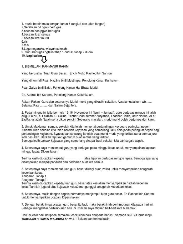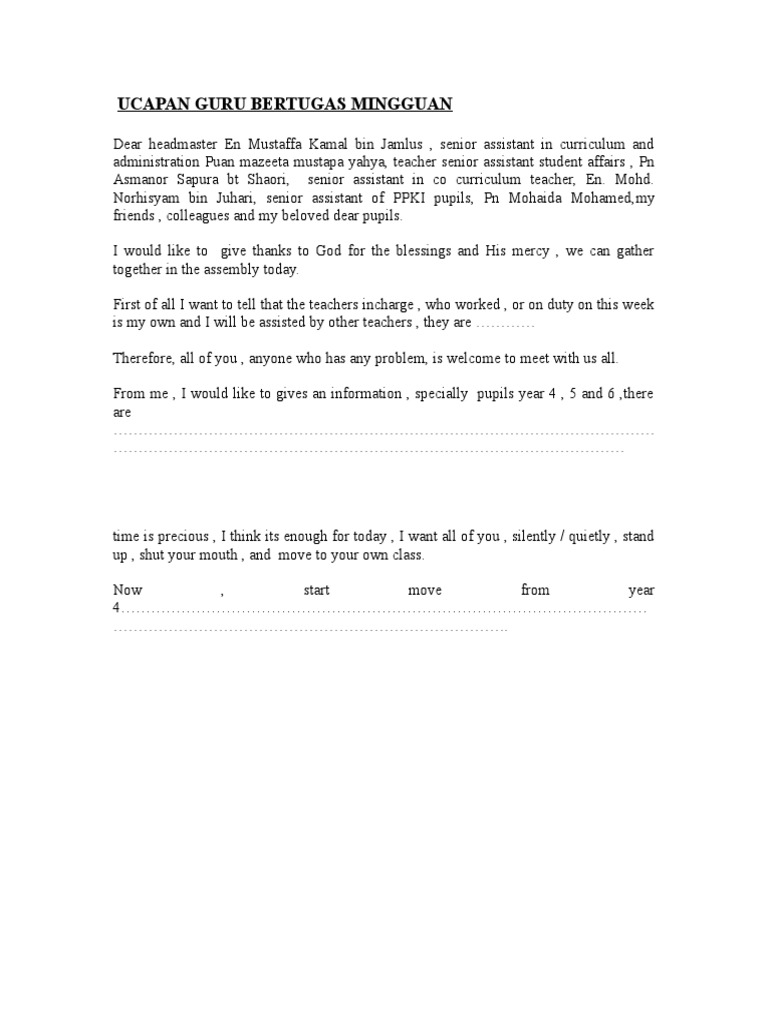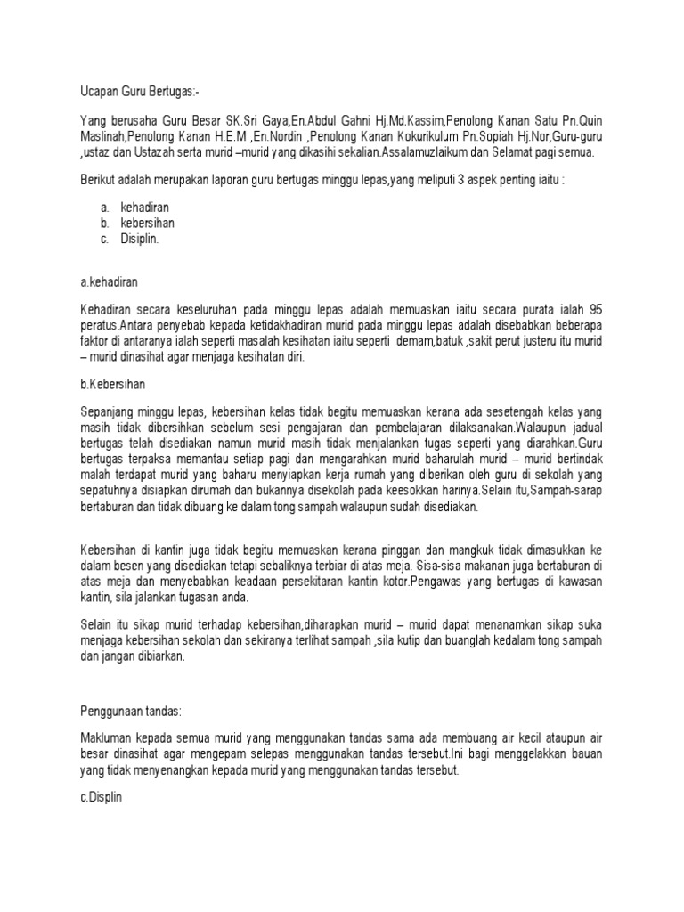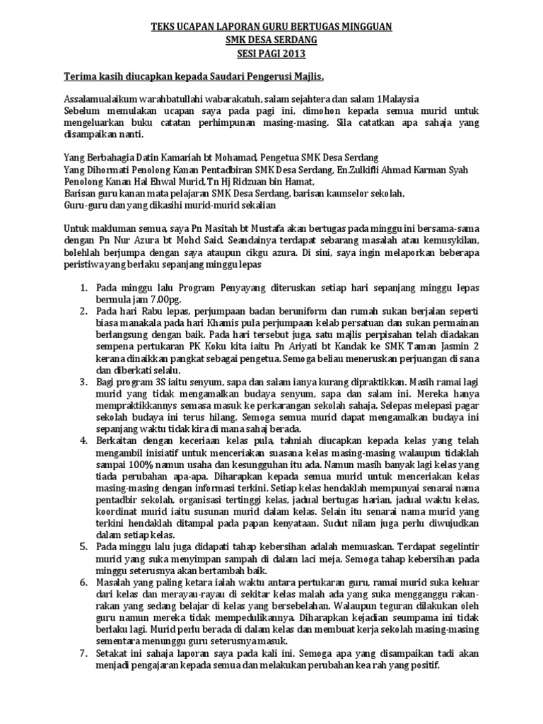 Teks ucapan guru bertugas semasa perhimpunan mingguan sekolah (to address concerns about learning environment) assalamualaikum warahmatullahi wabarakatuh salam sejahtera dan selamat pagi terima kasih saudara pengacara majlis yang berusah. Teks ucapan mingguan guru bertugs. Wakil pdrm iaitu koperal mohd hazlan bin kasbulah membaca teks ucapan perutusan ketua polis negara dari pdrm iaitu tan. Minggu ke 6 laporan harian guru bertugas nama guru pelapor : Kelas bertugas ialah 3ex jadi 3ex.