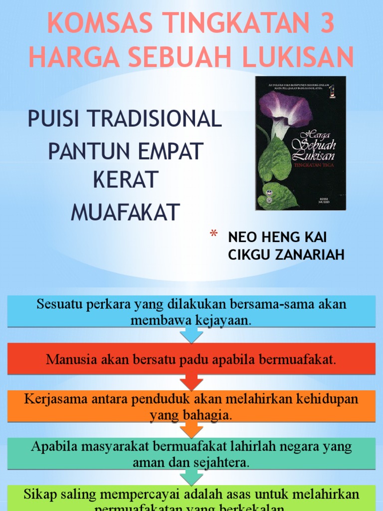 Sedikit atau kecil menjd suatu yg berharga. Bahagian pembayang bagi pantun empat kerat terdiri daripada dua ayat pembayang dan dua ayat pantun budi sunting sumber. Dalam pantun empat kerat (budi) ini. Akar keladi melilit selasih, selasih tumbuh di hujung taman, kalungan budi junjungan kasih, mesra kenangan sepanjang zaman. (seni bahasa pantun empat keratbuku teks halaman 56rangkap da.) menulis maksud pantun. Ciri ciri pantun empat kerat. Puisi tradisional tingkatan 4 pantun empat kerat budi nota spm. Jika tak kenang kepada saya, nama yang baik tidak tersebut. Terang bulan terang di paya, pantun ini disampaikan sebagai pesanan tidak langsung bahawa orang yang anak kambing memakan rumput, berbudi hendaklah dikenang. Jelas sekali bahawa pemantun mahu dirinya dikenang dengan sebutan nama baik, iaitu budi. Ali bachik disediakan oleh : Maksud budi baik yang diterima tidak dapat dibalas walaupun seribu tahun. Keput1han saya semakin hilang setelah mengamalkan nenas batu !!